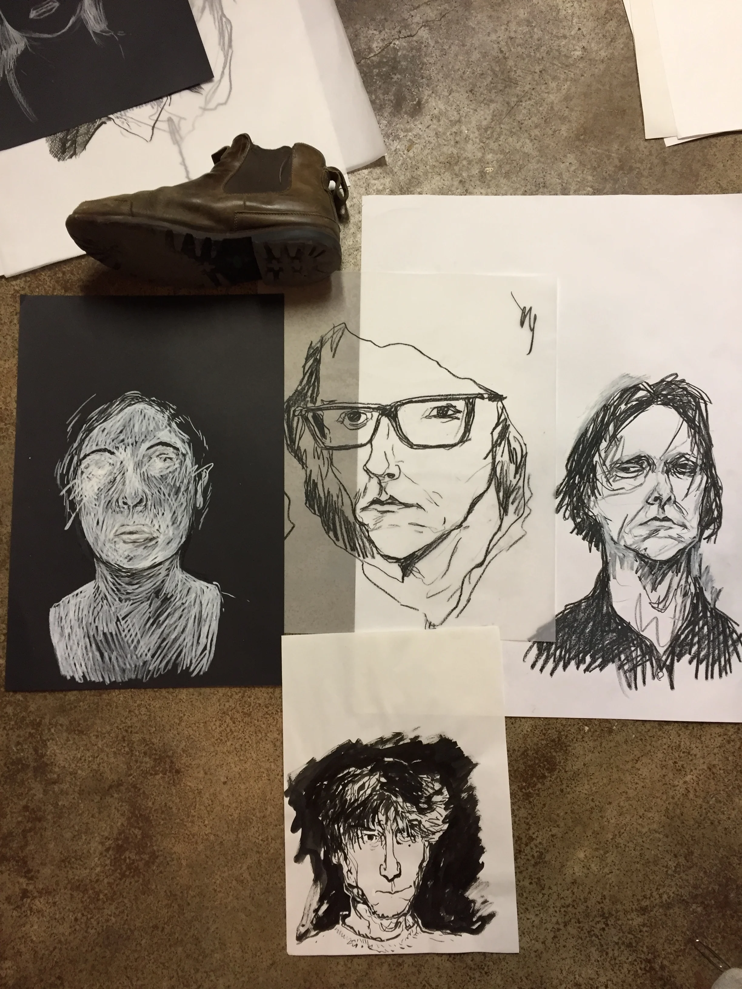 a lot of these drawings are kind of great, and i’d rather people HAVE them than they sit in my flat file gathering dust. so what i did is made sets of 4 drawings each (one each of Sara and Vern, and 2 of Justin. not because i love him more, but because i could NOT get his damn face right, so i’ve got twice as many of him...). some of them are real loose and gestural, some are detailed illustrations, some are ink, some are pencil, some are white on black paper, it’s all over the map. i tried to give a nice mix in each set. but they are mostly pretty big and there is some damn nice stuff in there if i do say so myself. there’s at least one in each set that’d be a $100 drawing if i was asking freelance prices. so here’s what we’re doing (with Unwound’s blessing, naturally):